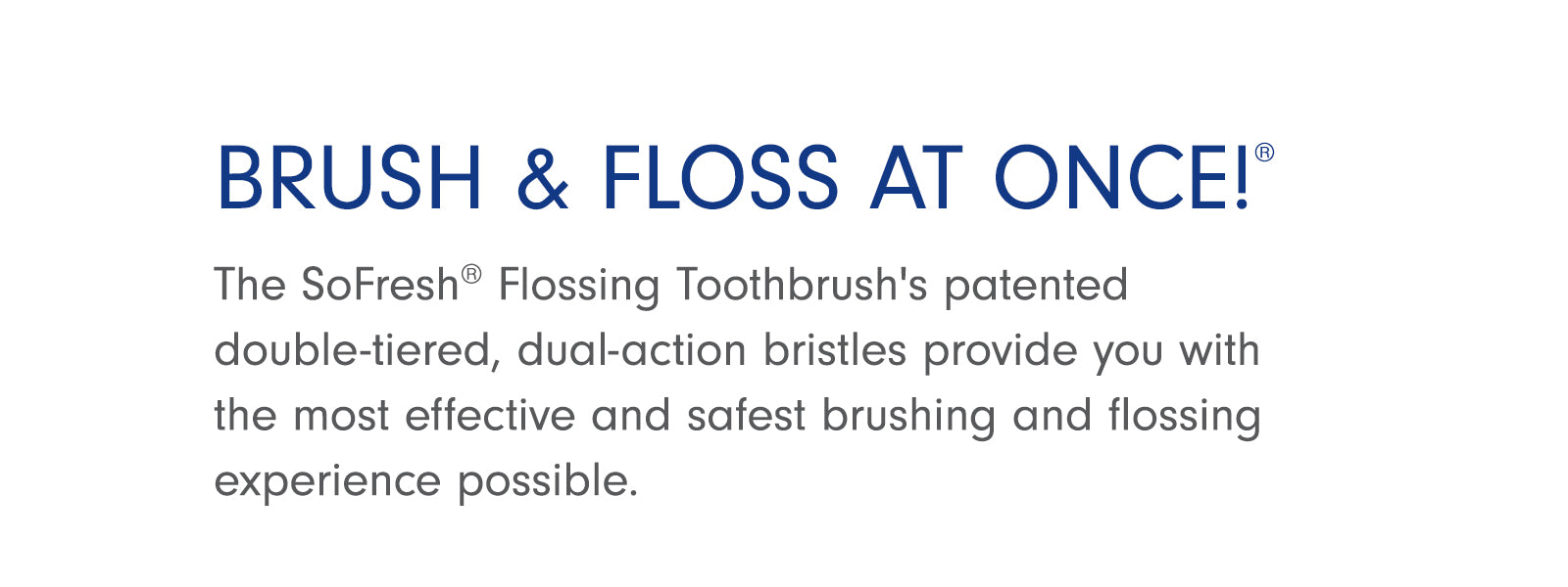“I just wanted to drop a note about how happy I am with the Flossing Toothbrush. I have been using it for about 6 months now and cannot believe the difference. My gum line looks healthier. My teeth look cleaner and best of all because of the soft bristles my gums don’t bleed when I brush anymore. Since I am someone who has a hard time flossing regularly, the flossing bristles do a marvelous job picking up the slack. Thank you for offering such a wonderful product.”